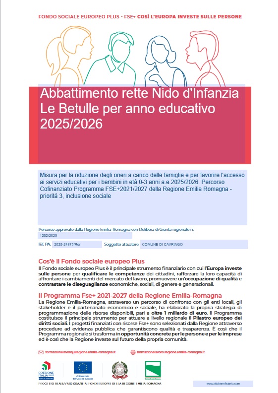 L’abbattimento delle rette è stato possibile grazie alla Regione Emilia-Romagna che, con delibera di Giunta Regionale n. 1202 del 21/7/2025, ha messo a disposizione delle risorse, co-finanziate dal Fondo Sociale Europeo Plus.