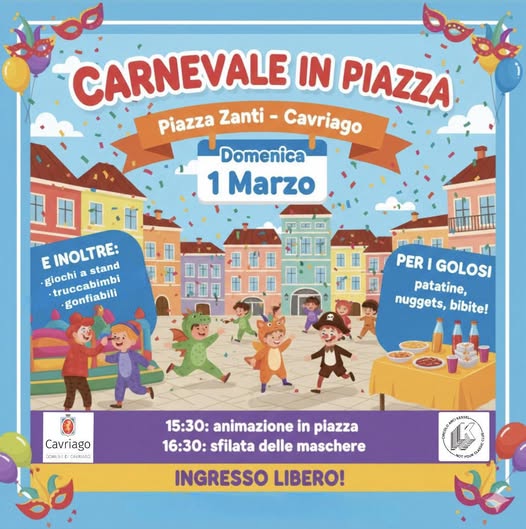 I ragazzi e le ragazze di Cuariegh on the Road organizzano per domenica 1 marzo 2026 dalle ore 15.30 in piazza Zanti la festa di Carnevale, con il patrocinio del Comune di Cavriago.