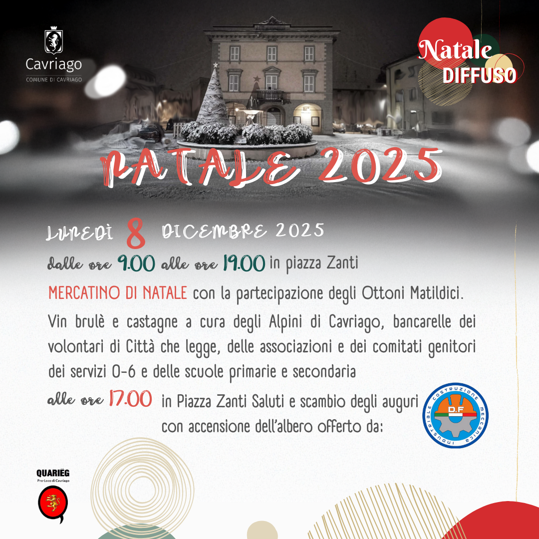 Calendario ricco di eventi per il Natale Diffuso 2025 di Cavriago: di seguito l'elenco. E' possibile sacricare in fondo a questa pagina le locandine degli eventi generali e degli appuntamenti dedicati ai più piccoli.