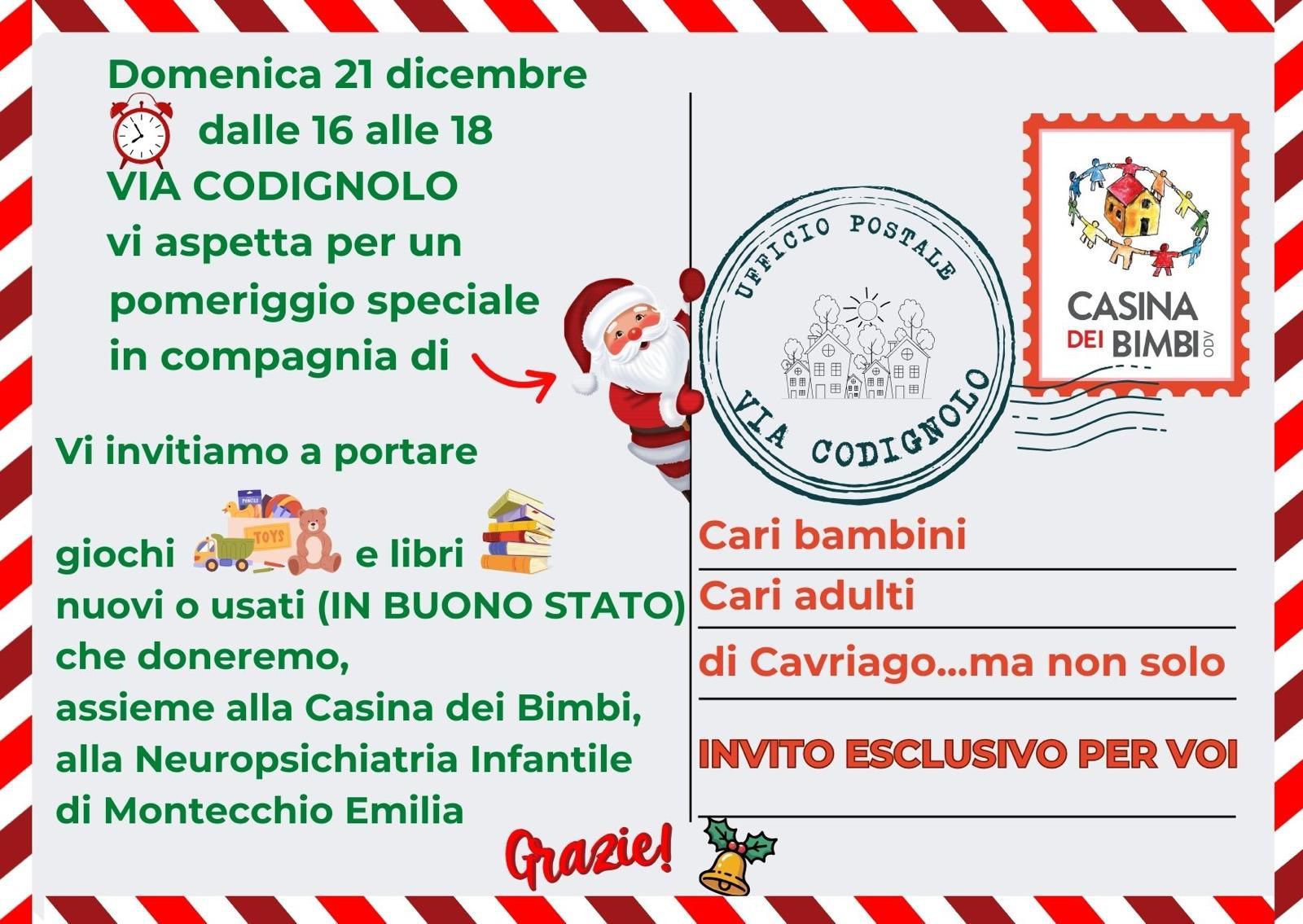 Il 21 dicembre dalle ore 16.00 alle ore 18.00 via Codignolo aspetta bambini e adulti per un pomeriggio speciale in compagnia di Babbo Natale: verranno raccolti giochi e libri nuovi e usati che verranno donati alla Neuropsichiatria Infantile di Montecchio.