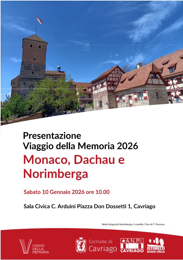 Dal 19 al 22 marzo 2026 ANPI Cavriago organizza il Viaggio della Memoria in Germania e più precisamente a Monaco, Dachau, Norimberga, tre tappe che ripercorrono la parabola della storia nazista dalla presa del potere alla caduta. Per tutta la durata del viaggio sarà presente un ricercatore storico di Istoreco.